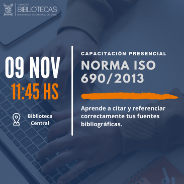 Te invitamos a participar en el Taller: Aplicando correctamente la norma ISO 690 2013, se realizará el día 9 de noviembre a las 11:45 AM en Biblioteca Central.