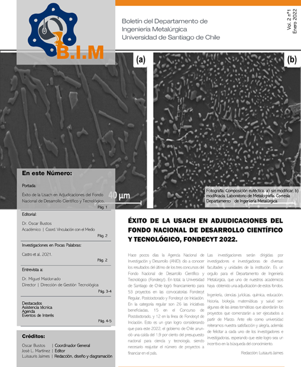 Boletín Vol. 2 / N° 1Por Departamento de Ingeniería Metalúrgica / Enero 3, 2022 Ver el Boletín Ver todos los Boletines